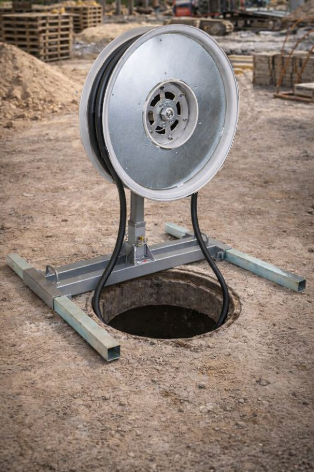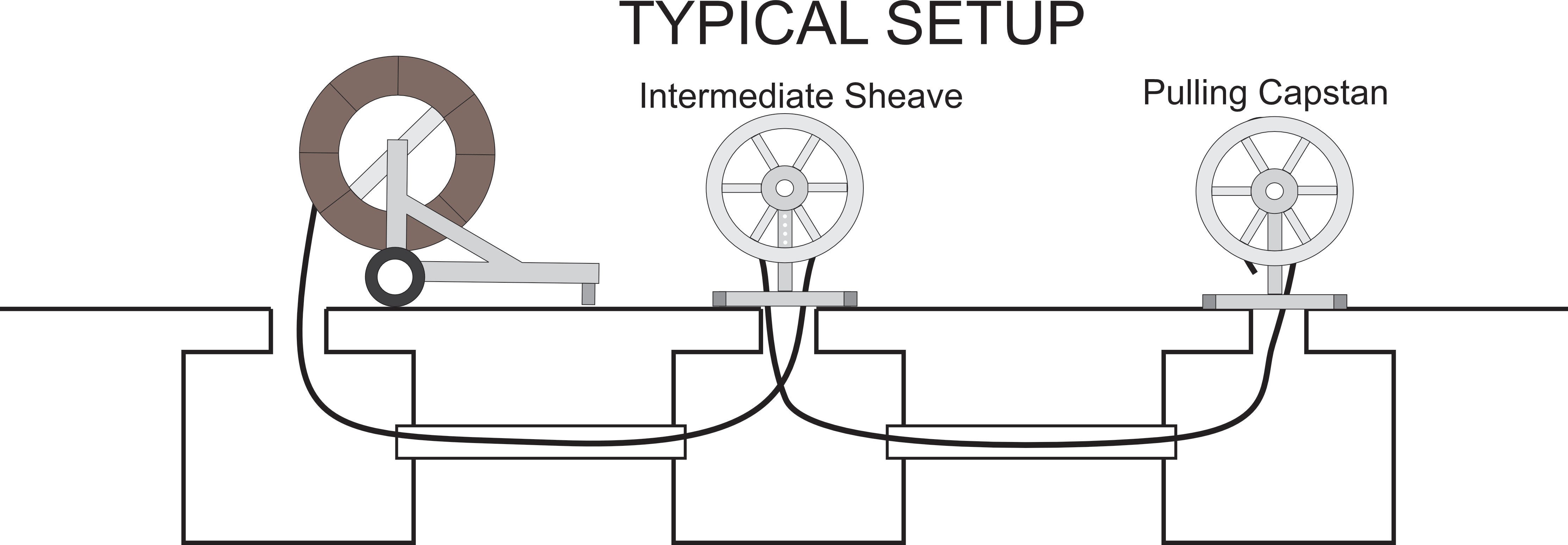 Installed over a manhole or intermediate access point, this heavy-duty sheave allows fiber cable to lead up, wrap smoothly around the drum, and continue into the next conduit section without tight angles or excessive tension. The free-spinning design eliminates binding, reduces stress on the cable, and ensures a smooth, controlled transition across conduit offsets.